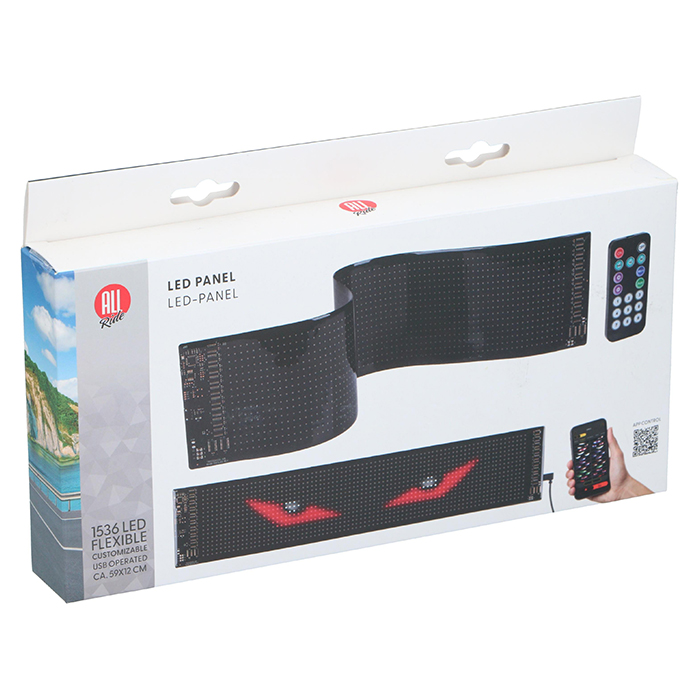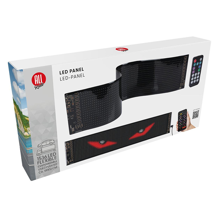 Det kompakte Allride LED-panel Devil Eyes str. L (59 × 12 cm) er den perfekte løsning til dig, der ønsker et kraftigt og fleksibelt LED-display i et mindre format. Panelet er udstyret med hele 1536 LED’er, som giver skarpe farver, tydelige symboler og levende animationer – inklusiv den velkendte Devil Eyes-effekt. Du kan nemt tilpasse panelets visning via Bluetooth-app eller den medfølgende fjernbetjening, hvor du frit kan oprette rullende tekst, justere farver, vælge effekter eller designe helt egne animationer.