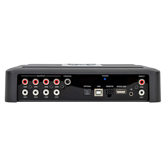 Derudover kan du udvide systemet: Der er fire DSP-konfigurerbare RCA-udgange (kanaler 5–8) for fx subwoofer eller ekstra forstærkere, som kan indstilles via DSP-softwaren med filtre, forsinkelse og equalizer indstillinger.