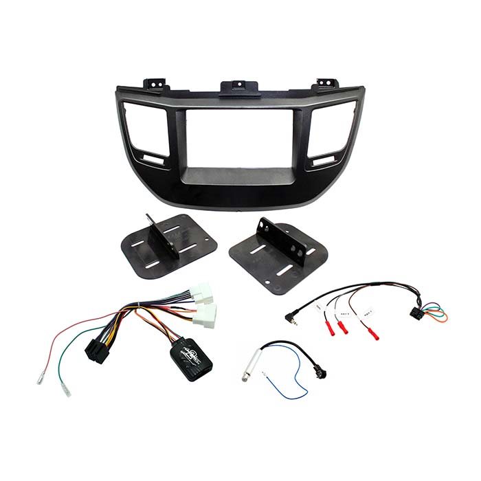Hyundai Tucson installation kit. Leveres med sort dobbelt DIN Fascia, ratkontrolinterface, antenneadapter og universal patchledning.