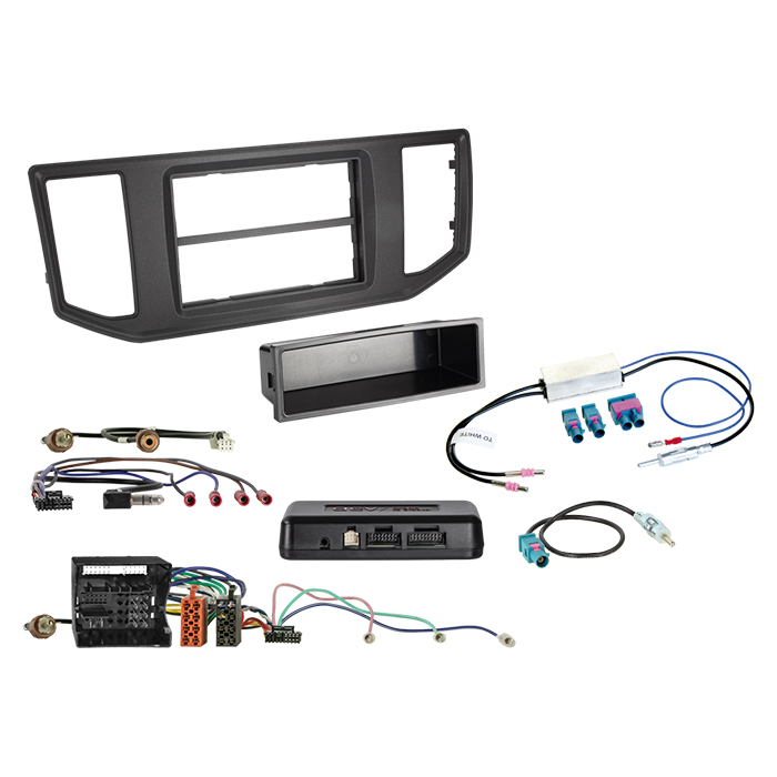 Komplet monteringskit til udskiftning af original (OEM) radio/head unit med en eftermarkeds 2-DIN radio i MAN TGE, VW Crafter II og VW Grand California. Sættet indeholder 2-DIN facia/radioramme med praktisk opbevaringsrum samt interface/adaptere, så bilens vigtige funktioner kan bevares via CAN-bus (afhængigt af udstyr og software).