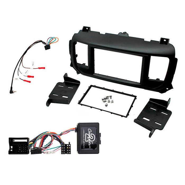 Til installation af dobbelt DIN-hovedenhed. Beholder rattet kontrolknapper, telefon knapper og bageste parkering sensor lyd. Giver hastighedspuls, parkbremse og bagudgange. Færdiggjort i sort (matt). Inkluderer universal patch lead.