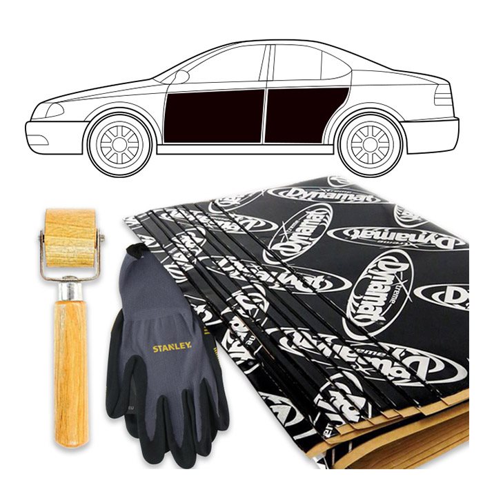 Sættet giver 1,11m² selvklæbende vibrationsdæmpemateriale til montering i bilens 4 døre. I sættet medfølger handsker og Dynamat Economy Wood Roller til påføring.