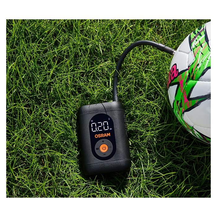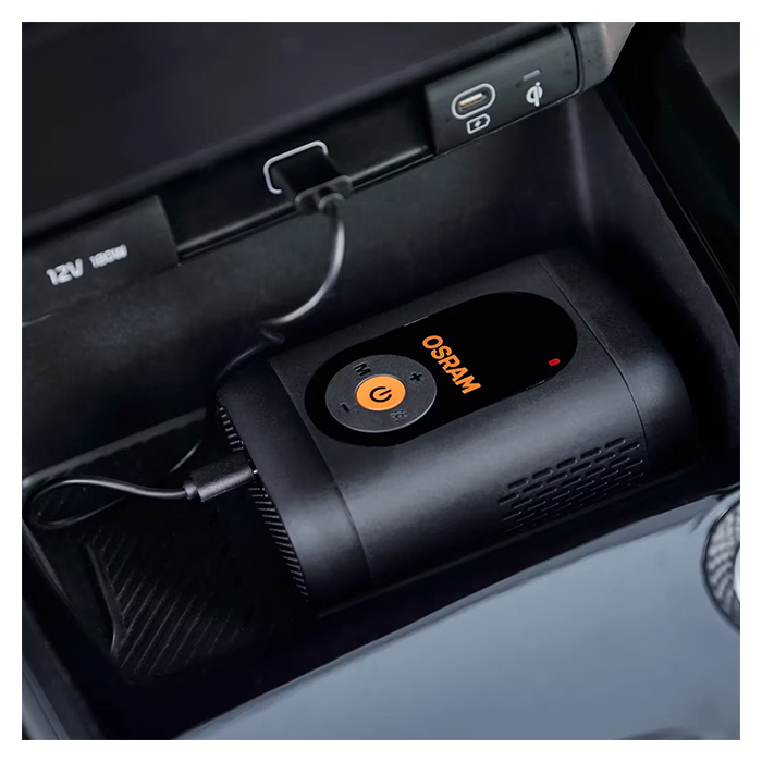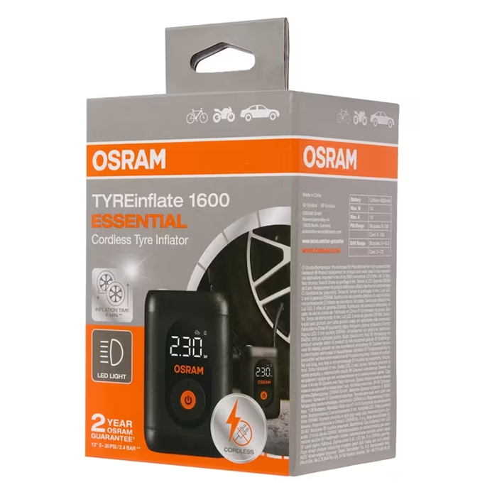 OSRAM TYREinflate 1600 ESSENTIAL er en kompakt og genopladelig digital mini-kompressor, udviklet til hurtig, nem og præcis oppumpning – uanset hvor du befinder dig. Den trådløse konstruktion gør den ideel til bilister, motorcyklister og cyklister, der ønsker en praktisk løsning til daglig dækvedligeholdelse eller uventede situationer på farten.