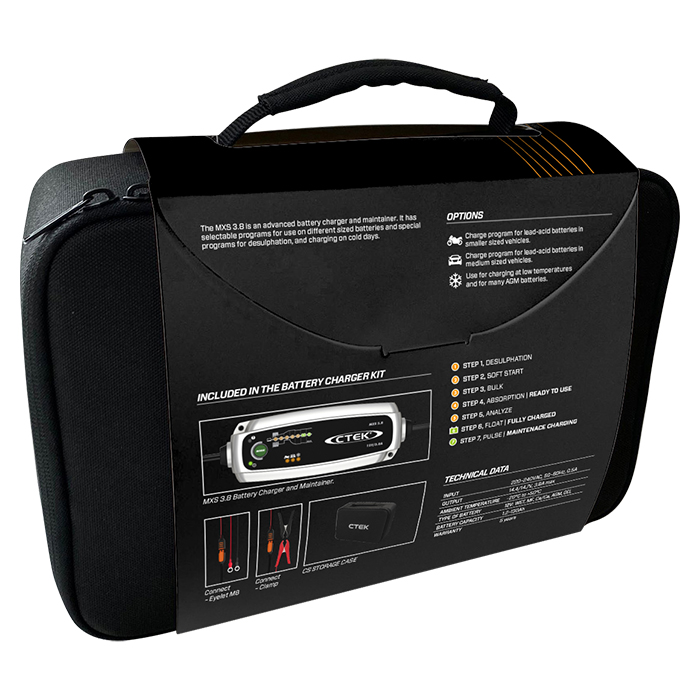 MXS 3.8 er en moderne batterioplader og vedligeholder. Den har valgbare programmer til brug på batterier af forskellig størrelse og specielle programmer til afsulfatering og opladning på kolde dage. Laderen styres af en mikroprocessor, med patenteret Float/Pulse-vedligeholdelse til brug på batterier fra 1.2–130 Ah