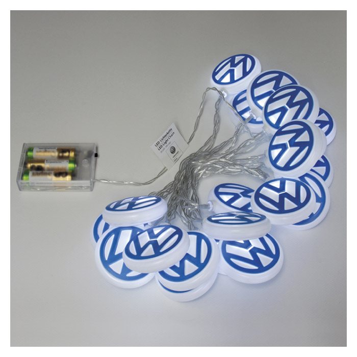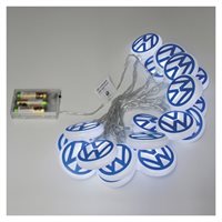 Denne lyskæde med glødende plastikikoniske VW-lanterner vil lyse enhver fanfest op og er et "must-have" for enhver ægte Volkswagen-fan. Liv dit værksted op med dette sjove blikfang. VW lyskæden har 20 LED-lys og et gennemsigtigt kabel. De bør kun bruges indendørs og kun udendørs, hvis vejret er tørt, fordi de ikke er vandtætte. Den samlede længde er 3 meter, hvoraf 30 cm er fødeledningen til batterikassen.