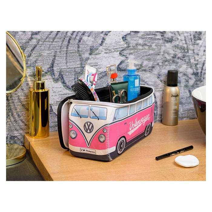 Unik universal toilettaske / kosmetiktaske lavet af blød neopren og formet som VW T1 bus i pink.
