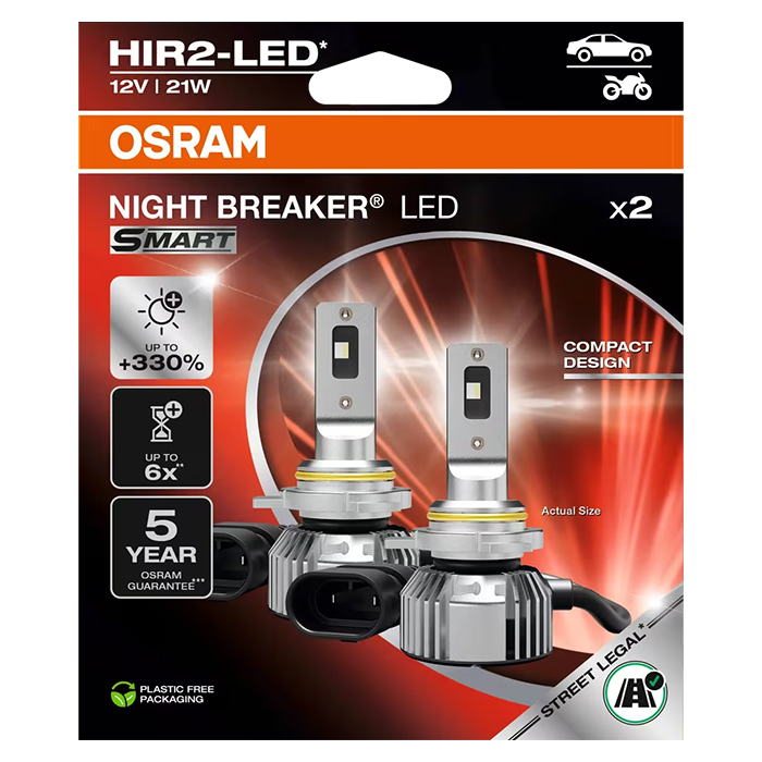 Med Osram Night Breaker LED HIR2 kan du nu opgradere dine originale pærer til den nyeste LED-teknologi til brug på vejene. Disse LED-udskiftningslamper er velegnede som erstatning for konventionelle HIR2-pærer.