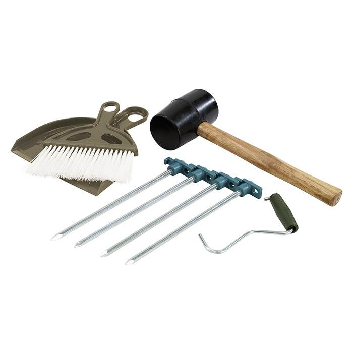 Praktisk teltkit gør dig klar til ferien. Ekstraudstyr til opsætning, nedtagning og oprydning i telte.