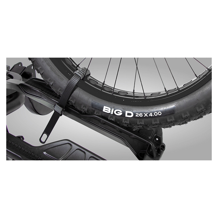 E-HORNET 2 er udstyret med brede hjulholdere, der passer til de fleste dæktyper – også brede elcykeldæk op til 4”. Cyklerne fastgøres nemt med låsbare rammeholdere og robuste remme til hjulene. Både cykler og selve holderen kan låses for at forhindre tyveri.