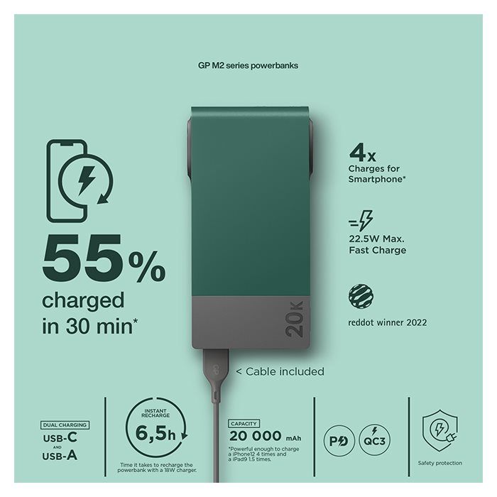 - Powerbanken måler 13.8 cm x 6.7 cm x 2.7 cm