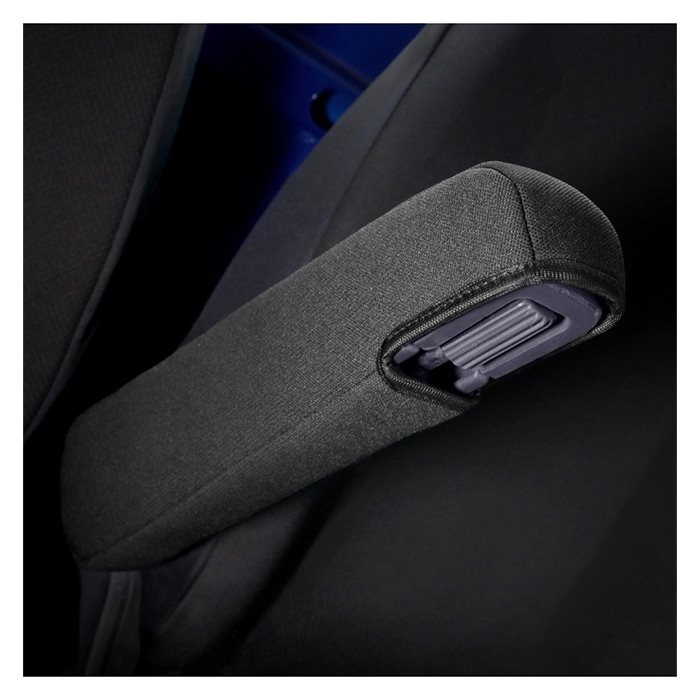 Disse sædeovertræk beskytter bilens originale polstring mod slid og skader, mens det klassiske og stilrene design giver et æstetisk løft. Den afdæmpede farvekombination af sort med en diskret grå tekstur midt i betrækket passer harmonisk ind i ethvert bilinteriør. En af fordelene ved betrækkene er, at de dækker hele bagsiden af ryglænet.